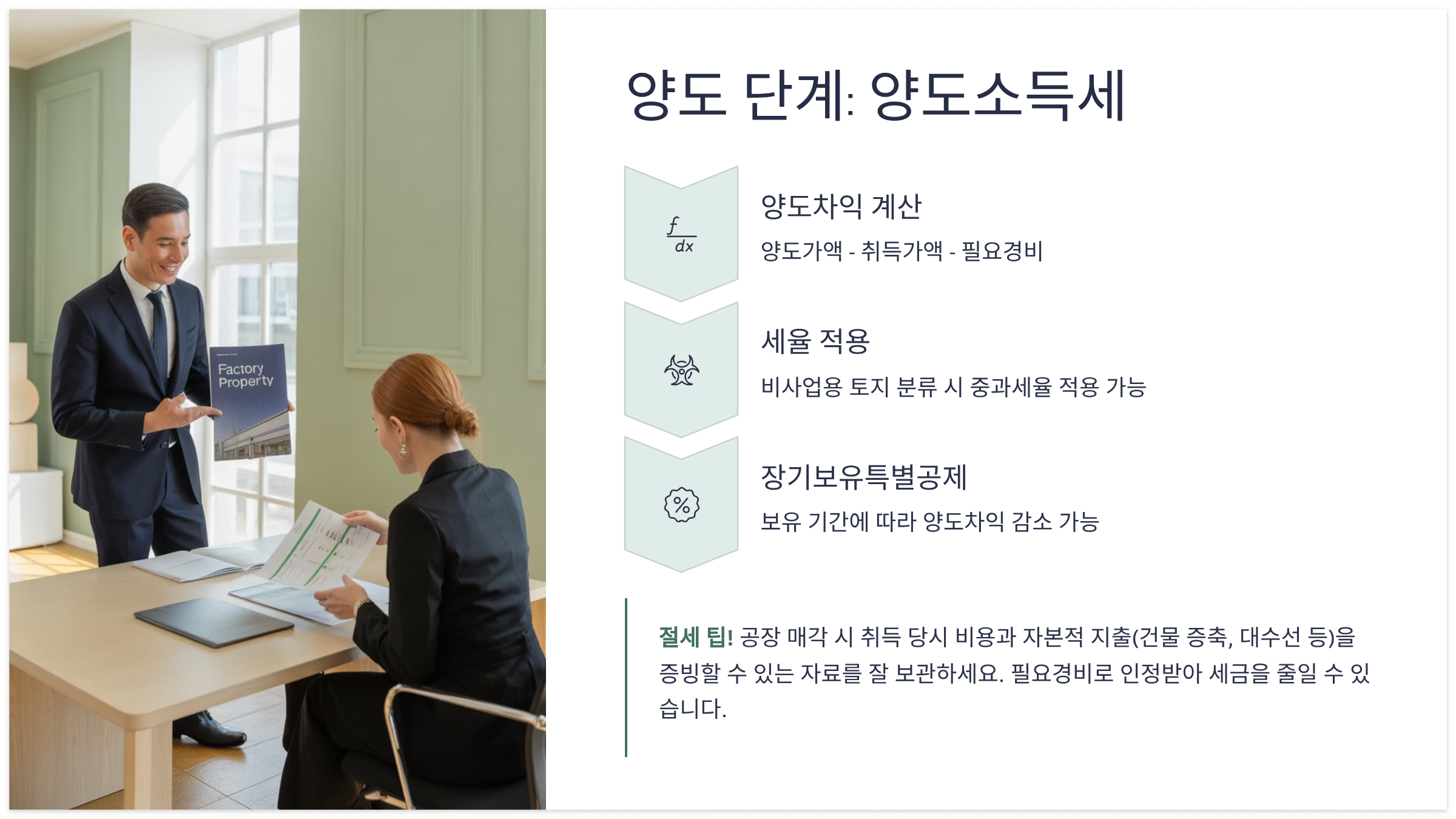 공장 매각 시 양도소득세를 줄이려면, 취득 당시 비용뿐만 아니라 자본적 지출(건물 증축, 대수선 등)을 증빙할 수 있는 자료를 잘 보관해 두세요. 필요경비로 인정받아 세금을 줄일 수 있습니다.