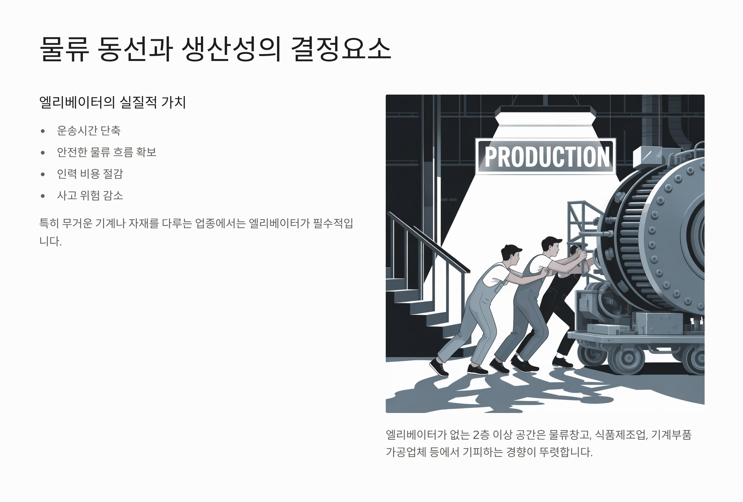 공장 내 수직 이동은 단순한 층간 접근 이상의 의미를 가집니다. 특히 무거운 기계나 자재를 다루는 업종의 경우, 엘리베이터는 **운송시간을 단축하고, 지게차 대신 안전한 물류 흐름을 확보**하는 수단이 됩니다.