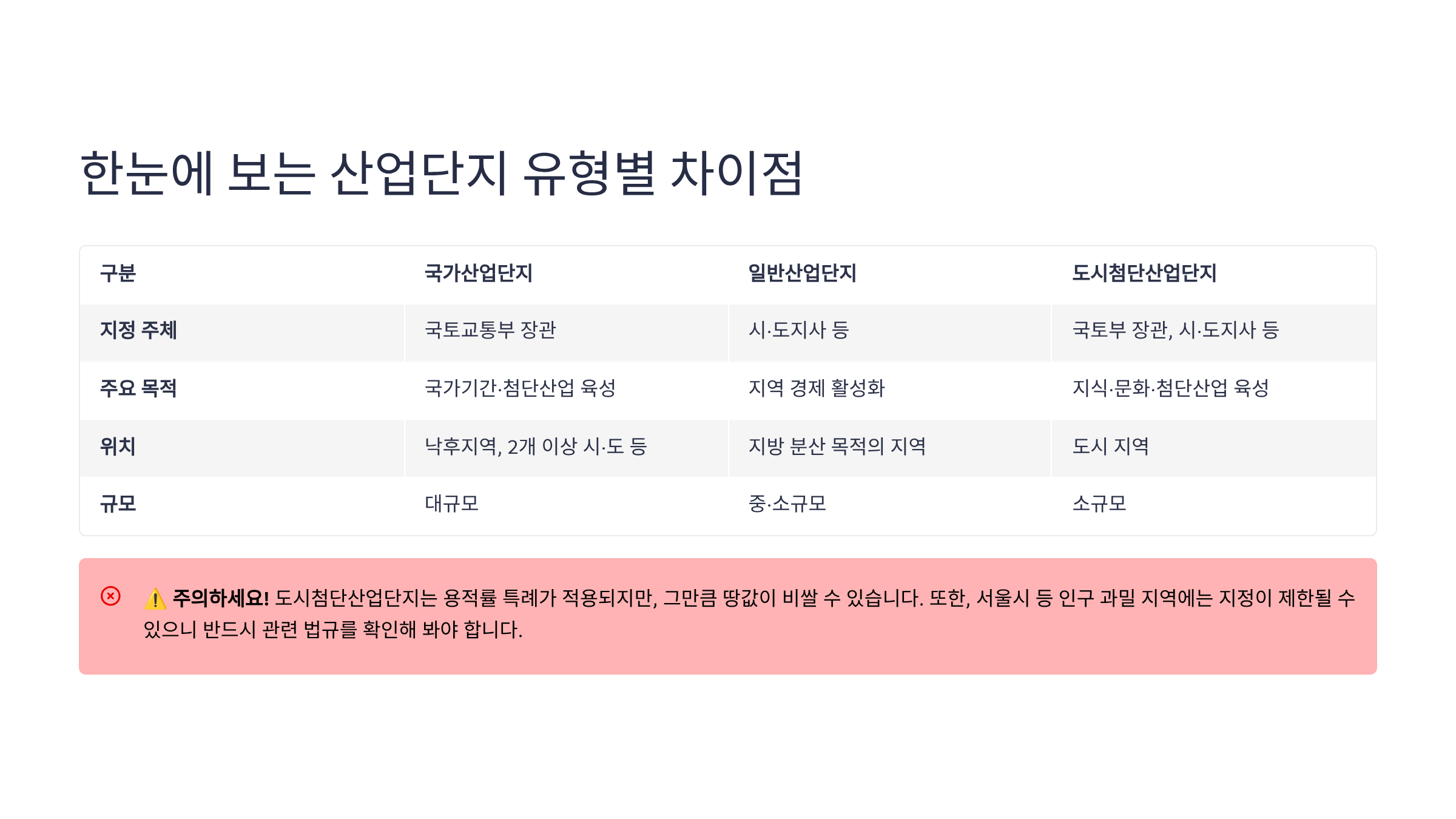 정리해 보면 각 산업단지마다 지정 목적과 주체, 그리고 주요 특징에서 분명한 차이가 있어요. 아래 표를 보면서 비교하면 훨씬 이해하기 쉬울 거예요!
